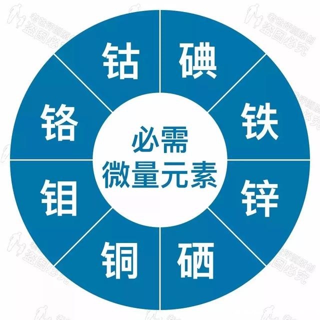 其次是微量元素,占体重的0.05%,包括铁、铜、锌、铬、钴、锰、镍、锡、硅、硒、钼、碘、氟、钒等14种,这些微量元素在人体内的含量虽然微乎其微,但却能起到重要的生理作用。如果一种元素供应不足,该元素就会缺货;如果摄入过多的某种微量元素,也会发生中毒。